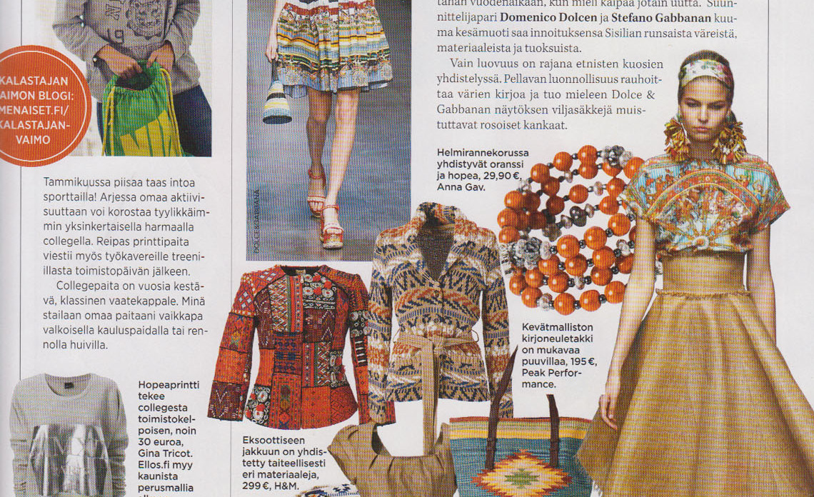 Many fashion magazines and newspapers publish an articles of Finnish artist and jewelry designer Anna Gav.  Her jewelry collections and artworks coverage in Elle, Cosmopolitan, M Magasine, Gloria, Me Naiset, Eeva, Saara, Olivia,  Kotiliesi, Kauneus ja terveus, Muotimaailma, Iilona, Demi, Helsingin Sanomat, Iltalehti, Moda, Kodin kuvalehti, Anna, Häät, Voi Hyvin, Sport, TG, Tara, Solo, Amelia, Tove, Allas, etc.