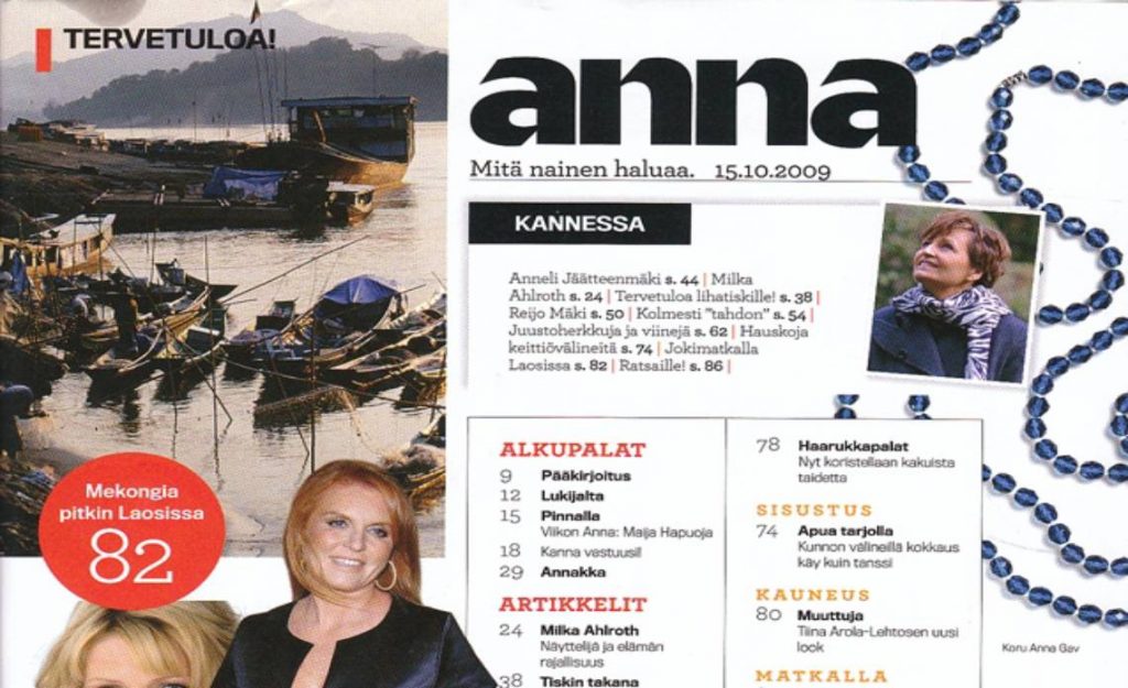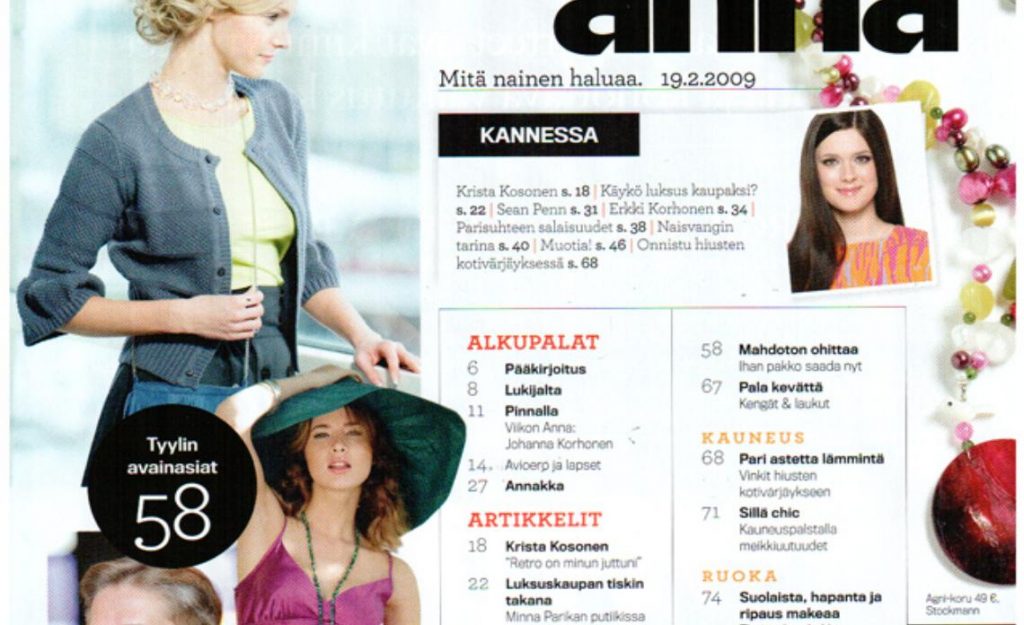 On the cover of magazine Anna, Susanna Rahkamo wears Anna Gav necklace and earrings.